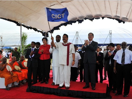 斯里蘭卡總統(tǒng)馬辛達(dá)·拉賈帕克薩出席了項(xiàng)目揭幕儀式及開工典禮。當(dāng)招商局集團(tuán)董事長傅育寧把科倫坡國際集裝箱碼頭公司旗傳遞給斯里蘭卡總統(tǒng)拉賈帕克薩之后,總統(tǒng)揮動(dòng)小旗,指揮工程船開始吹填作業(yè),由此宣告該項(xiàng)目正式開工。 中交股份副總裁陳玉勝、斯里蘭卡港務(wù)局局長、港口及公路部副部長、中國駐斯里蘭卡大使楊秀萍分別在開工典禮上致辭。
