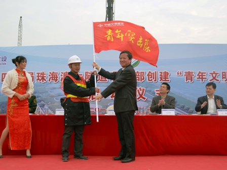 12月26日,一公司珠海澳大隧道項(xiàng)目部、研究院珠海神華軟基處理項(xiàng)目部分別舉行“青年突擊隊(duì)”授旗儀式,四航局黨委副書記張猛為兩項(xiàng)目部青年突擊隊(duì)授旗。