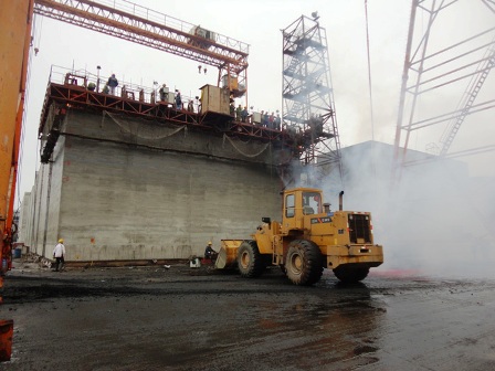該工程沉箱分兩種型號,最大單位沉箱長18米、寬12米、高16.8米,重1568噸。沉箱預制自2011年5月28日開工,采用先澆底座、后滑模墻身的分層施工工藝。施工過程中,項目部成立QC小組,以“精益求精,鑄造精品”為理念,高標準高要求實施管理,精心編排施工方案,創(chuàng)造了三公司單月預制19件大型沉箱的新紀錄。