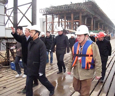 陳啟濤一行親切看望和慰問了春節(jié)期間堅守在工地的項目部工程建設(shè)人員。在南岸17號墩鋼箱梁施工現(xiàn)場,陳書記認真聽取了項目部關(guān)于施工進度、安全、質(zhì)量等情況的匯報,詳細詢問了箱梁制作及頂推施工情況,高度肯定了項目部為蚌埠“三年大建設(shè)”所做出的積極貢獻。他強調(diào),今年是大橋施工的決戰(zhàn)年,希望項目部再接再厲,迎難而上,確保順利實現(xiàn)2013年元旦通車的目標(biāo)。