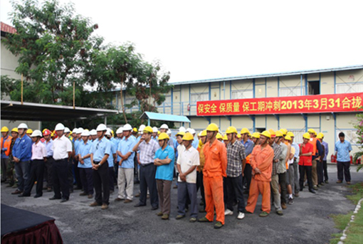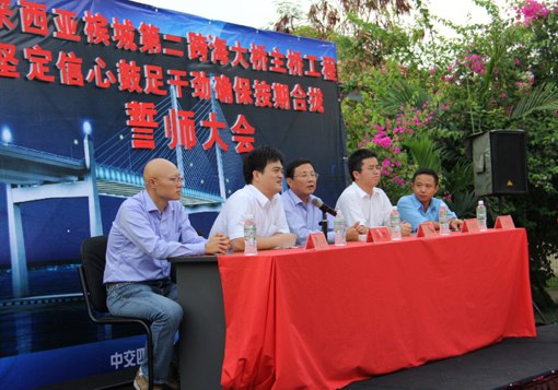 3月20日,馬來西亞檳城二橋項目部召開了“保安全、保質(zhì)量、保工期沖刺2013年3月31日主橋合攏”誓師動員大會,再次掀起趕工熱潮。中港項目總部副總經(jīng)理范強生、一公司副總經(jīng)理吳浩等領(lǐng)導,各參建隊伍代表共計100多人參加了誓師動員大會。