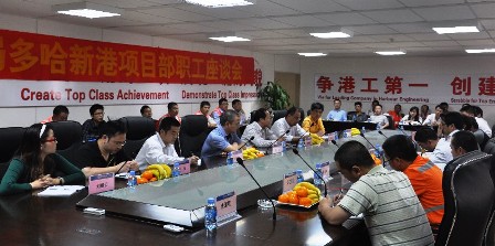 李惠明一行視察了施工現(xiàn)場,了解重要分項工程的建設(shè)情況及施工進(jìn)度,并出席了多哈新港項目部員工座談會。會上,李惠明對項目部全體員工在艱苦環(huán)境中付出的努力給予了肯定,對員工的身心健康和年輕員工的發(fā)展表示關(guān)心和慰問。