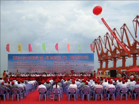 5月15日,潮州市隆重舉行2012經(jīng)貿(mào)洽談會暨一批重點項目動(竣)工儀式。儀式為包括亞太碼頭一號泊位在內(nèi)的8個重點項目動竣工推桿剪彩,掀起了推動港口建設(shè)、發(fā)展臨港經(jīng)濟的新一輪項目建設(shè)高潮。潮州市市委副書記、市長李慶雄等領(lǐng)導(dǎo),香港潮屬社團總會會長陳幼南,廣州港集團公司總經(jīng)理助理蔡南樹,香港汕頭商會會長黃成林,香港潮商互助社理事長余潔儂等出席典禮。四航局潮州港亞太通用碼頭項目部部分員工作為參建單位代表參加儀式。