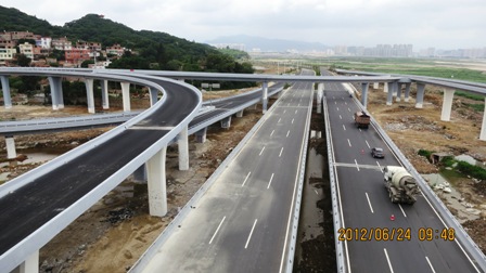 泉州市后渚立交項目于2011年2月開工,項目部合理組織施工,狠抓工程質量、安全和進度,經(jīng)過16個月的努力,順利完成了合同內2座主線橋和6座匝道橋(總長4921米)、480米路基路面工程、交通工程、照明工程等所有分部分項工程。