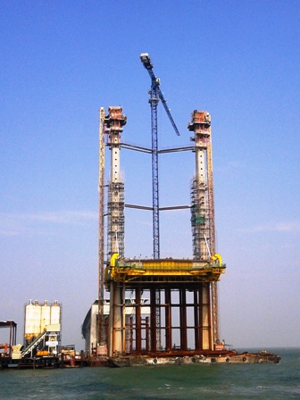 主橋工程是檳城第二跨海大橋全線關(guān)鍵控制性工程,而主塔的施工又是主橋工程建設(shè)的重點(diǎn)、難點(diǎn)。主塔為組合式H型直塔,由下塔柱、橫梁、上塔柱及塔尖組成,索塔高93.6米,下塔柱27.64米,橫梁高5米,上塔柱60.96米。塔柱采用液壓自爬模系統(tǒng)施工,橫梁采用落地大鋼管支架進(jìn)行施工。