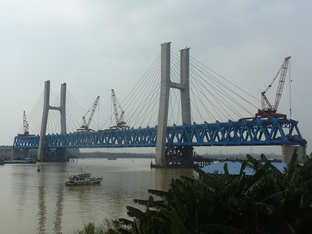 貴廣鐵路北江特大橋、思賢滘特大橋主橋均為563.5米,是我國高速鐵路建設(shè)史上,在四線鐵路橋梁中第一次采用雙主桁鋼桁梁斜拉橋結(jié)構(gòu),也是貴廣鐵路的關(guān)鍵控制性工程。這兩座橋梁設(shè)計和制造安裝難度大、創(chuàng)新多,建設(shè)過程中,各參建單位克服了經(jīng)濟(jì)、技術(shù)及橋位處施工環(huán)境等諸多困難,確保了鋼桁梁制造安裝安全、順利進(jìn)行。該節(jié)點(diǎn)的順利完成標(biāo)志著這兩座鋼桁梁斜拉橋的建設(shè)取得了階段性成果。