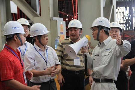 在沉管預(yù)制廠,考察團一行聽取了梁杰忠關(guān)于項目概況、施工流程和工藝創(chuàng)新的介紹,并深入鋼筋加工區(qū)、綁扎區(qū)、模板區(qū)、深淺塢區(qū)和觀景平臺,查看了鋼筋加工、鋼筋籠綁扎及頂推、混凝土澆筑、管節(jié)一次舾裝等施工場景,考察了沉管預(yù)制廠的整體布局、生產(chǎn)進度、現(xiàn)場管理等情況,與梁卓仁、梁杰忠交流了管節(jié)浮運沉放安裝、防腐防裂防滲的施工方法和風(fēng)險防控措施。