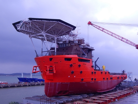 該船功能多樣、技術(shù)先進,具備DPS-2動力定位系統(tǒng)和對外消防功能,在船艏部配有直升機起降平臺,船艉甲板面安裝了有支持100噸海工的吊機,甲板面直達船底水域的月池可實現(xiàn)潛水服務(wù)功能。兩船均有ACCU(無人機艙)入級符號,專用壓載水艙滿足PSPC要求。