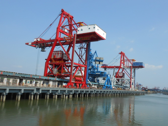 該工程主要包括在原碼頭平臺下增建混凝土實心墩臺,并對原碼頭結構進行加固和防腐、附屬設施更新及碼頭港池、航道疏浚等。改造后,碼頭靠泊能力由5萬噸級提升到7萬噸級,可有效提高碼頭吞吐能力和工作效率。