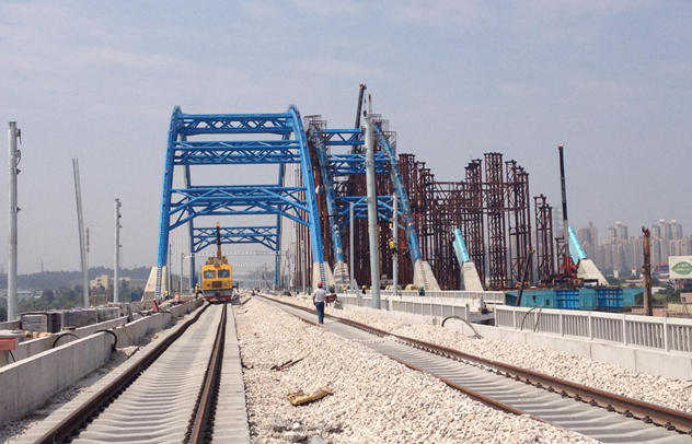 該橋主橋?yàn)椋?4+160+24)米剛架拱鋼箱連續(xù)梁組合橋結(jié)構(gòu),可容兩條軌道線。主梁為單箱三室扁平鋼箱梁,梁高3.5米,主跨橋面寬15.74米,邊跨橋面寬14.74米。拱肋與主墩固結(jié),為鋼管混凝土結(jié)構(gòu),跨度160米,鋼拱肋最大起重量39噸。