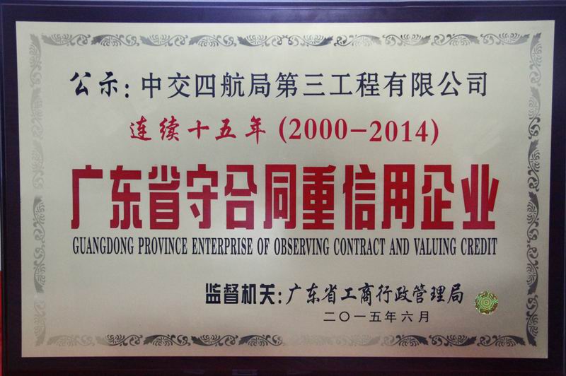 日前,四航局三公司獲評(píng)2014年度“廣東省守合同重信用企業(yè)”稱號(hào),這是三公司自2000年到2014年連續(xù)15年獲得該榮譽(yù)。