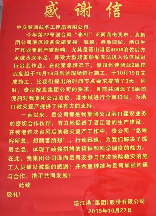10月27日,四航局收到湛江港(集團(tuán))股份有限公司發(fā)來的感謝信,對公司在強臺風(fēng)“彩虹”救災(zāi)復(fù)產(chǎn)工作中對湛江港的支持表示感謝。