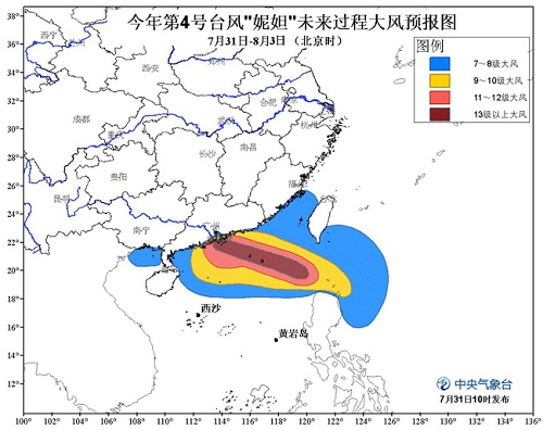中央氣象臺監(jiān)測顯示,今年第4號臺風“妮妲”(強熱帶風暴級)的中心7月31日下午5時位于菲律賓呂宋島北部近海海面,中心附近最大風力有11級。預計,“妮妲”中心將以每小時20至25公里的速度向西偏北方向移動,將于2日白天在廣東汕尾到陽江一帶沿海登陸,登陸時為臺風級或強臺風級。廣東省防總通報,臺風“妮妲”或正面襲擊廣東珠三角地區(qū),為廣東帶來“風、雨、浪、潮、洪”五碰頭的最不利情況,防災形勢極其嚴峻。省內多地發(fā)生城鄉(xiāng)內澇、中小河流洪水、山洪、地質災害的氣象風險較高,需加強防范。
