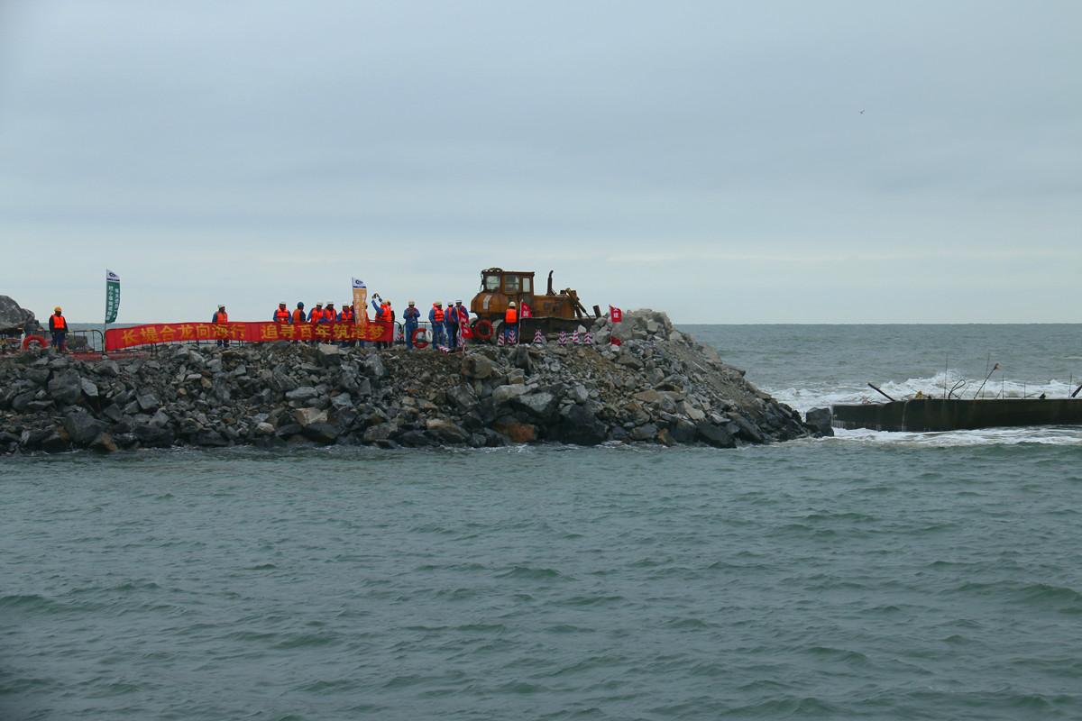 該工程于2013年底動(dòng)工建設(shè),其中東防波堤全長(zhǎng)5423米,由四航局三公司承建。13日上午,施工人員對(duì)堤身石料進(jìn)行最后推填,完成了東防波堤陸上推填、西防波堤水下拋填與各自口門沉箱的合龍,標(biāo)志該項(xiàng)目主體工程基本完成。