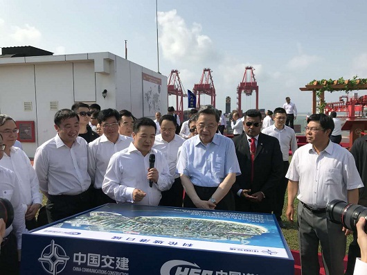 俞正聲首先來到科倫坡南港辦公樓,聽取了科倫坡港口城項目情況的介紹,并遠眺項目施工現(xiàn)場。中國交建現(xiàn)場施工船舶鳴笛致敬,吹沙場面壯觀。隨后,俞正聲來到科倫坡港口城項目部,看望慰問了中國港灣、四航局等建設(shè)單位一線員工,分別聽取了中國交建和招商局的工作匯報。劉起濤介紹了中國交建的發(fā)展概況,特別是在海外踐行“一帶一路”戰(zhàn)略取得的豐碩成果,并匯報了中國企業(yè)“走出去”面臨的挑戰(zhàn)以及相關(guān)建議、應(yīng)對舉措。