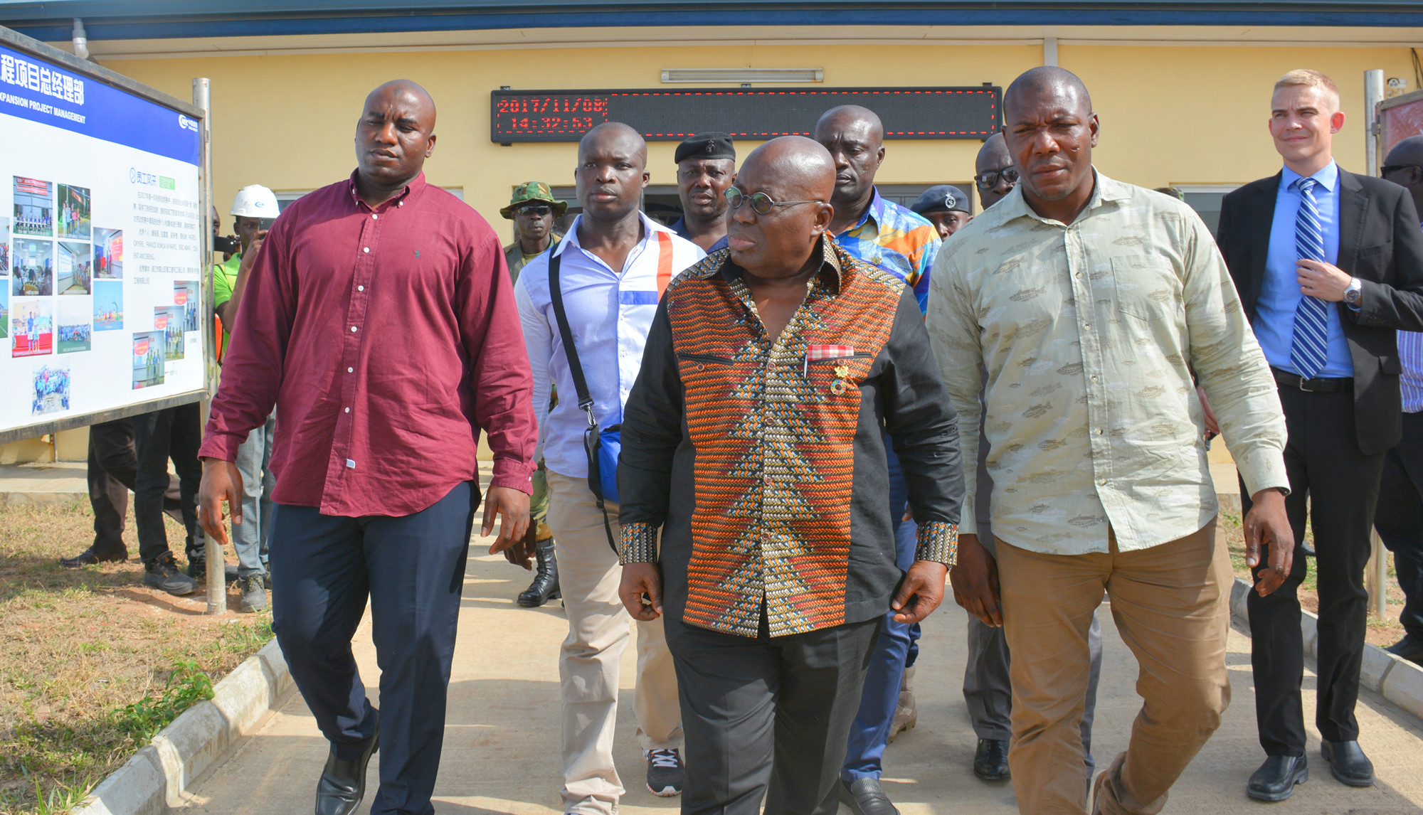 11月8日,加納總統(tǒng)納納·阿庫(kù)福—阿多(Nana Akufo-Addo)在特碼市長(zhǎng)和相關(guān)人員的陪同下視察加納特碼新集裝箱碼頭工程項(xiàng)目。