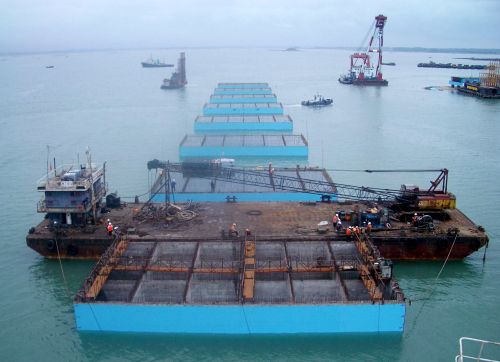 該工程一座長330米的10萬噸級煤碼頭需預制安裝沉箱10件,單件重達2938噸。面對沉箱預制、浮運、安裝安全風險大、施工組織難度高的挑戰(zhàn),防城港項目部制定科學合理的施工方案,做好技術安全交底,制定"沉箱出運安裝應急預防措施","四航防城港"號提前到現(xiàn)場進行試潛,并認真組織好典型施工,于6月26日安全優(yōu)質高效完成了10個重型沉箱的出運安裝任務。