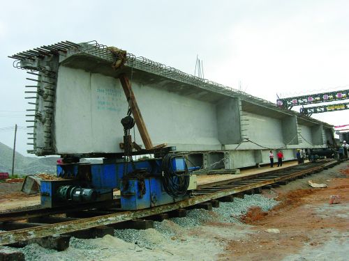 7月16日,一公司漢英項(xiàng)目部和橋梁分公司員工冒著近40度的高溫,通力合作成功吊裝武湖特大橋第一片長30米、重達(dá)70余噸的T梁。該項(xiàng)目共有T梁948片,按業(yè)主要求,7月要吊裝30片T梁。目前,漢英項(xiàng)目部掀起預(yù)制安裝T梁施工高潮。 (曾 苑)
