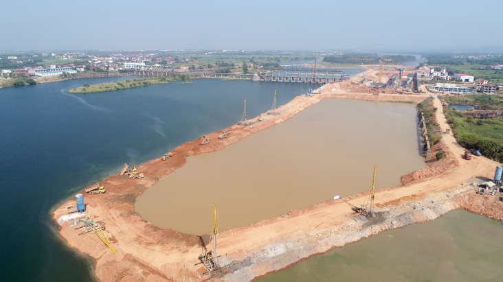 江西界牌項目枯期圍堰分上、下游枯期圍堰,其中上游枯期圍堰長808米,下游枯期圍堰長1032米,整個上下游枯期圍堰同步施工。項目部努力克服了施工工期緊、交叉作業(yè)面廣、施工難度大等困難,共計投入40余臺重型自卸車、2臺巖石破碎機、13臺挖掘機等設備,填筑土石方量近39萬方,確保了項目圍堰工程的順利完成。